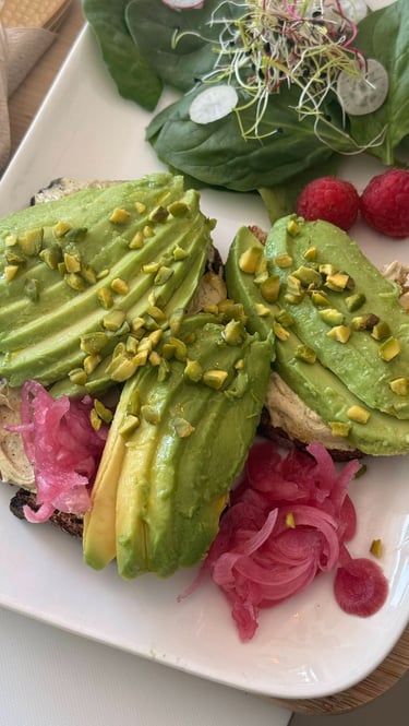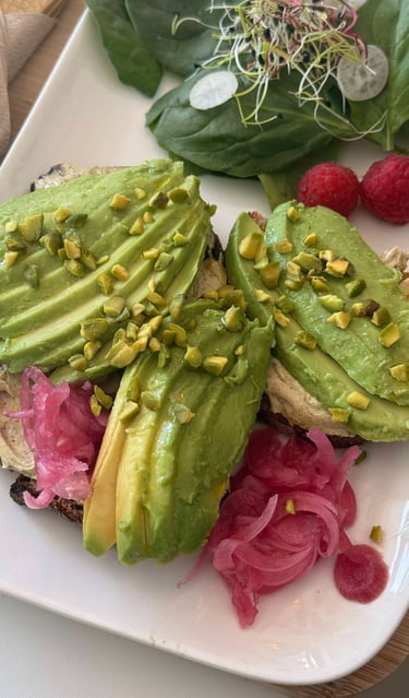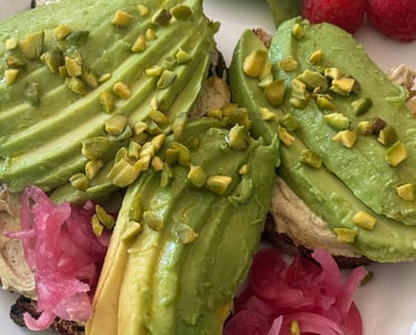 Pain de campagne toasté, cream cheese à la pâte de pistache bio, avocat, avocat & pickle d'oignons.