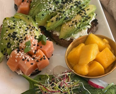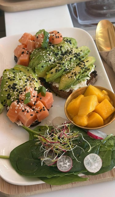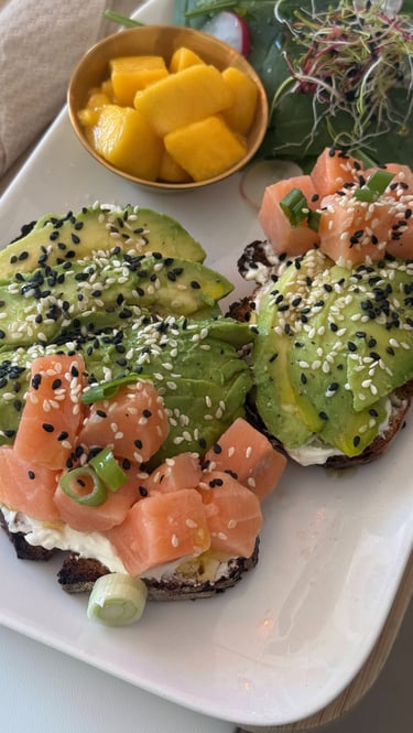 Pain de campagne toasté, cream cheese, avocat, saumon cru, cébette, mangue, & graines de sésame