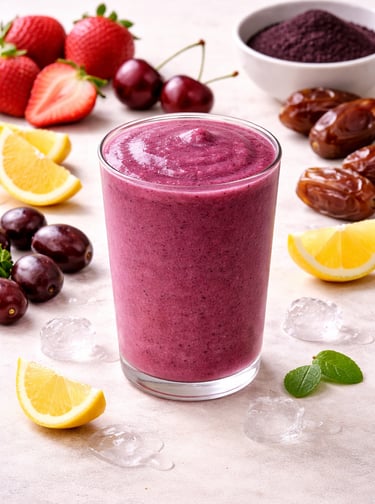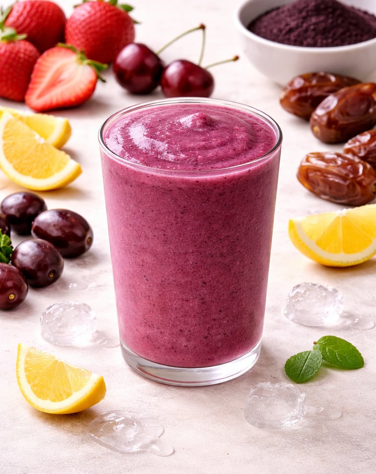 Cerise, myrtille, banane & lait d’amande, fruité et acidulé.