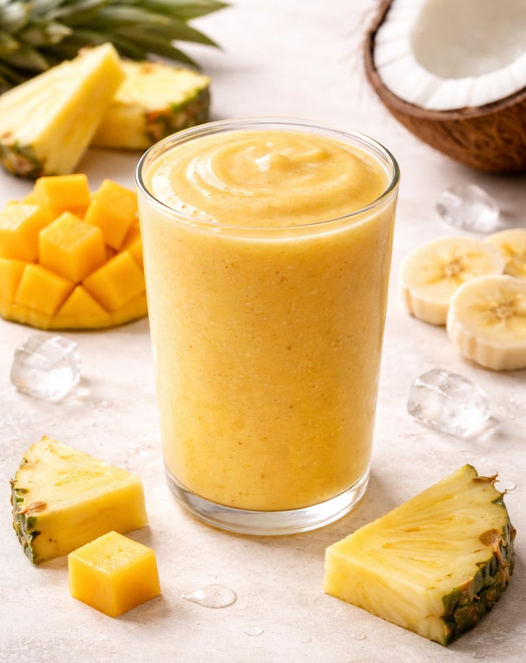 Ananas, mangue, banane & lait de coco, gourmand et crémeux.